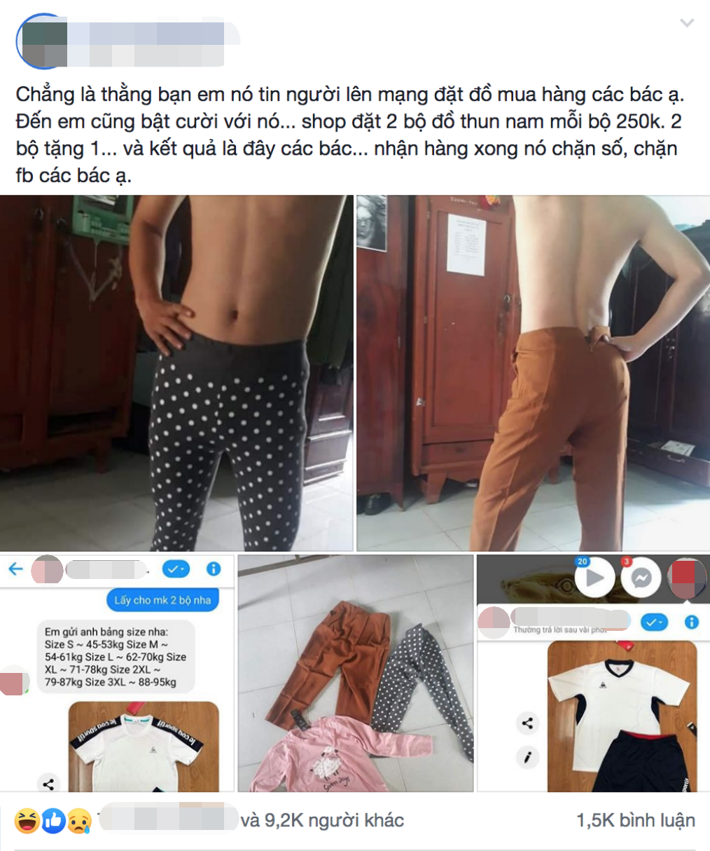 Theo đó, một anh chàng có tên V.N đã kể về câu chuyện đặt hàng qua mạng của bạn mình như sau: "Chẳng là bạn em nó tin người nên lên mạng đặt đồ mua hàng các bác ạ! Đến em cũng bật cười với nó. Shop đặt 2 bộ đồ thun nam mỗi bộ 250k, 2 bộ tặng 1 bộ. Và kết quả là đây các bác. Khách nhận hàng xong nó chặn số, chặn Facebook các bác ạ!".