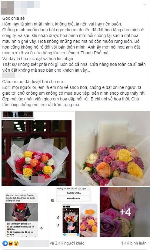 Theo đó chị T.X kể lại: "Hôm nay là sinh nhật mình mà không biết là nên vui hay nên buồn. Chồng mình muốn dành bất ngờ cho mình nên đã đặt hoa tặng cho mình ở công ty. Và sau khi nhận được hoa mình mới hỏi chồng tại sao anh đặt hoa màu nhìn ghê vậy. Hoa không những héo mà nó còn muốn rụng luôn. Bó hoa cũng không hề rẻ đối với bản thân mình. Anh ấy mới nói hoa anh đặt màu rực rỡ và ở cửa hàng lớn có tiếng ở thành phố mà.