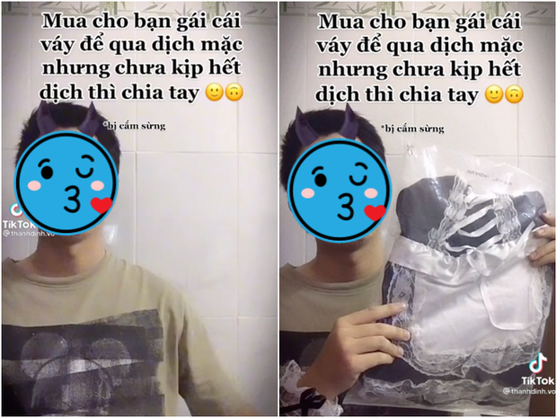 Cụ thể, đoạn clip dài 21 giây ghi lại gương mặt thơ thẩn, bần thần, sốc không nói nên lời của một thanh niên sau khi chia tay. Trên video, chàng trai thậm chí còn chèn filter hình chiếc sừng, thể hiện tâm trạng đau đớn của người đàn ông khi bị bạn gái "cắm sừng". Trên tay thanh niên, dân mạng không khó để nhận ra bộ đồ hầu gái - trang phục hay xuất hiện trong những bộ phim 18+. Quà tặng cho người vẫn còn đây, nhưng cô gái của mình nay đã là cô gái của người ta mất rồi!