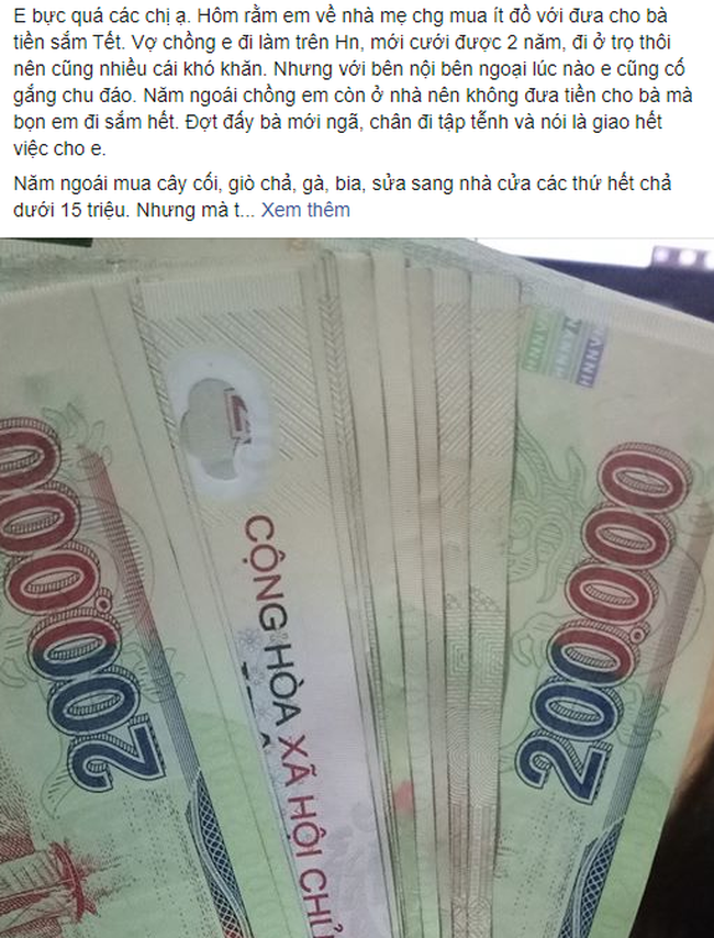 Thế mà bẵng đi vài ngày, bà chị hàng xóm nhắn tin trên face cho em bảo là: 'Mày không đưa tiền cho mẹ chồng sắm Tết à hay đưa ít quá? Hôm qua thấy sang tâm sự với mẹ chị có vẻ thất vọng với con dâu lắm?'.