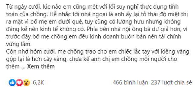 Câu chuyện của cô như sau: "Từ ngày cưới, lúc nào em cũng mệt với lối suy nghĩ thực dụng tính toán của chồng. Hễ nhắc tới nhà ngoại là anh ấy lại tỏ thái độ miệt thị ra mặt vì bố mẹ em dưới quê, tuy cũng có lương hưu nhưng không đáng kể nên kinh tế không có. Phía bên nhà nội ông bà dư giả hơn, vì trước đây bố mẹ chồng em đều kinh doanh buôn bán nên tài chính vững lắm.