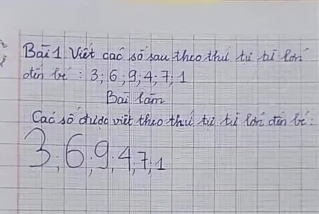 Mới đây, một bài Toán đã được cậu bé Tiểu học giải theo cách không giống ai. Đề bài yêu cầu: "Viết các số sau theo thứ tự từ lớn đến bé: 3, 6, 9, 4, 7, 1".