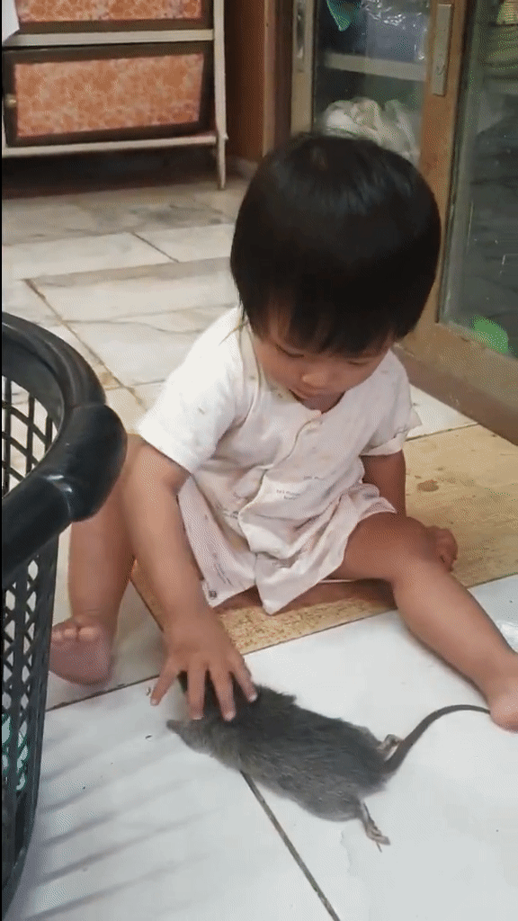 Bé gái càng tiến gần lại thì người mẹ càng tránh xa, thậm chí còn lấy điện thoại ra quay clip. Sau đó, một đoạn clip khác ghi lại cảnh bé gái tiếp xúc với chuột bằng tay trần, mũi, miệng...