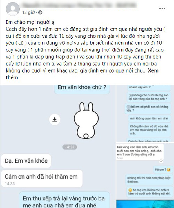Chàng trai kể: "Em chào mọi người ạ. Cách đây hơn 1 năm em có đăng status gia đình em qua nhà người yêu (cũ) để xin cưới và đưa 10 cây vàng cho nhà gái, vì lúc đó nhà người yêu (cũ của em đang vỡ nợ và sắp bị siết nhà nên nhà em có đi 10 cây vàng. (1 phần muốn giúp đỡ tại vàng thời điểm đấy đang rất cao và 1 phần là đáp ứng tráp đen) và sau khi nhận 10 cây vàng thì bên đấy lơ luôn nhà em ạ.