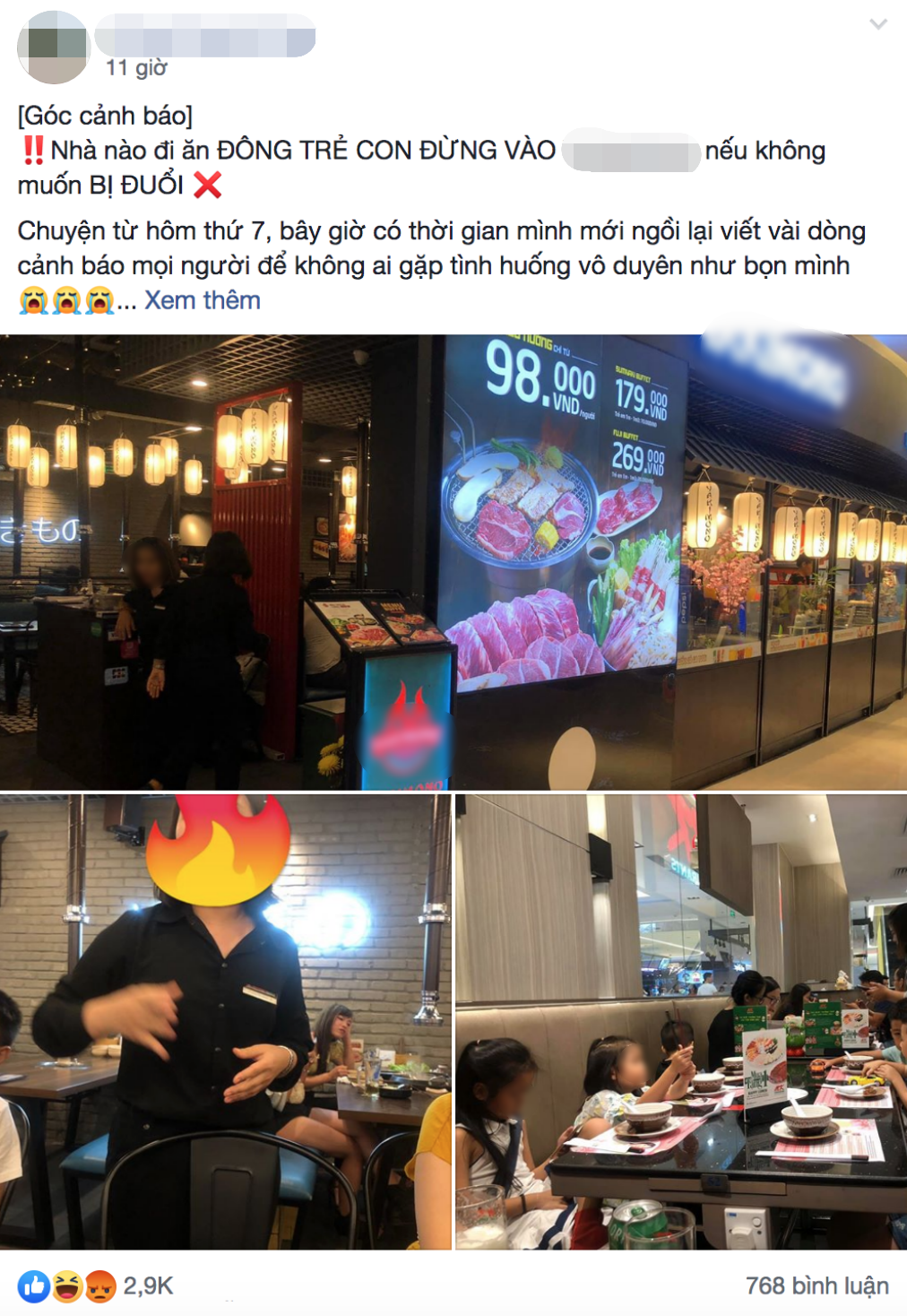 25/09/2019 17:20Đi ăn ở nhà hàng thịt nướng kiểu Nhật, mẹ trẻ bức xúc khi bị quản lý 'lật kèo' đuổi khéo vì đông trẻ con