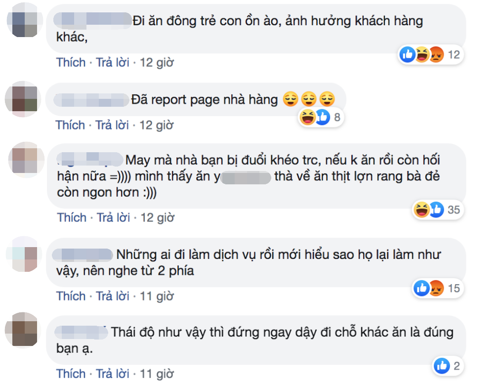 Chuyện sẽ chẳng có gì nếu ngay từ đầu nhà hàng nói hết bàn hoặc bàn đã được đặt trước hoặc nói thẳng đoàn chị 6 trẻ em bên em không tiếp. Đằng này để khách ngồi vào bàn, gọi đồ ăn, chờ 20 phút rồi thấy "có vẻ" nhiều trẻ con bèn lật kèo đuổi khéo khách".