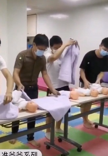 Có lẽ đây là lần đầu tiên anh chàng được lên chức bố cho nên là lóng ngóng lắm. Trong khi các ông bố bên cạnh thì chậm rãi làm mọi việc thì ông bố này lại có chút khó khăn. Chắc cũng vì địa hình chật chội quá mà anh ấy thì đang hết sức tập trung vào chiếc khăn nên thôi, đành để tạm "em bé" xuống nền nhà vậy.