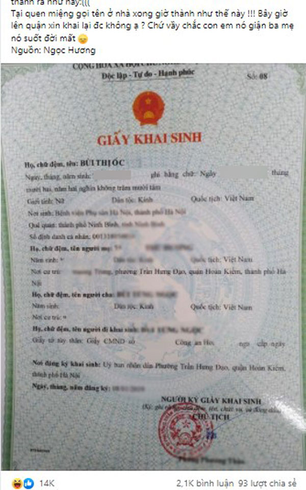 Chồng em đi liên hoan xong làm giấy khai sinh cho con em như này. Tại quen miệng gọi tên ở nhà xong giờ thế này đây. Giờ em lên quận xin khai lại được không ạ? Chứ vầy chắc con em nó giận ba mẹ nó suốt đời mất."