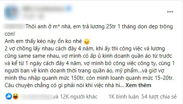 05/05/2022 18:20Đi làm 7 năm lương vẫn 15 triệu, vợ bảo chồng nghỉ ở nhà trông con, mỗi tháng cho 25 triệu có thưởng nhưng lại bị dân mạng can ngăn vì lý do ai cũng biết này