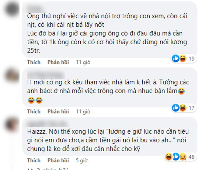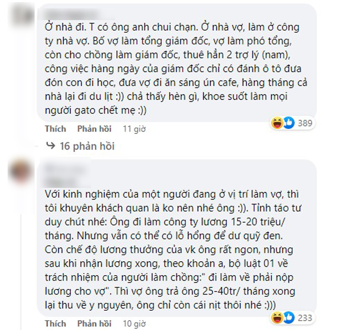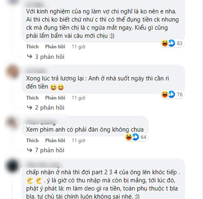 Câu chuyện có phần ngược đời này sau khi đăng tải đã nhận về khá nhiều ý kiến bình luận của cư dân mạng. Người thì cho rằng cô vợ khá chí lý, nếu anh chồng nghỉ thì cũng có lợi hơn. Bên cạnh đó, cũng có không ít bình luận cho rằng nếu anh chồng nghỉ hẳn thì sẽ bị mang tiếng ăn bám, không tốt cho hạnh phúc 2 vợ chồng sau này.