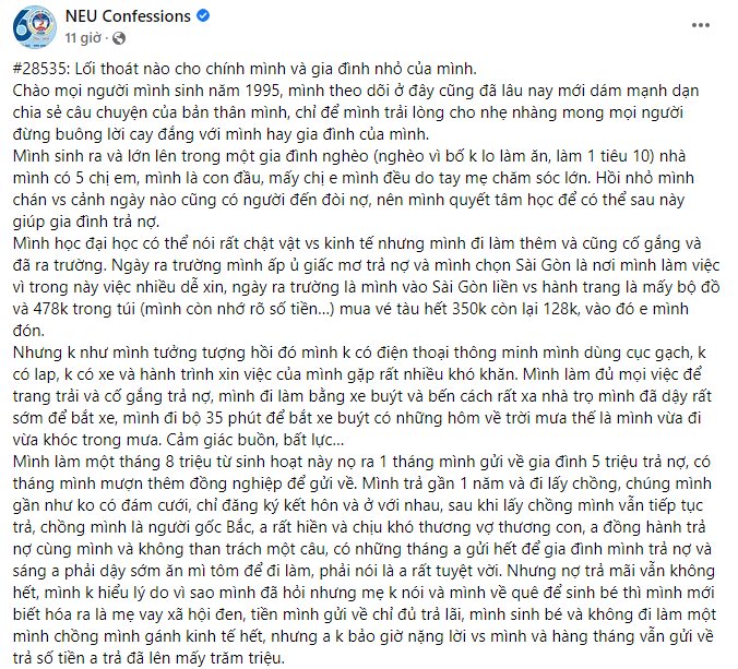 Mình làm một tháng 8 triệu từ sinh hoạt này nọ ra 1 tháng mình gửi về gia đình 5 triệu trả nợ, có tháng mình mượn thêm đồng nghiệp để gửi về. Mình trả gần 1 năm và đi lấy chồng, chúng mình gần như ko có đám cưới, chỉ đăng ký kết hôn và ở với nhau, sau khi lấy chồng mình vẫn tiếp tục trả, chồng mình là người gốc Bắc, a rất hiền và chịu khó thương vợ thương con, a đồng hành trả nợ cùng mình và không than trách một câu, có những tháng a gửi hết để gia đình mình trả nợ và sáng a phải dậy sớm ăn mì tôm để đi làm, phải nói là a rất tuyệt vời.