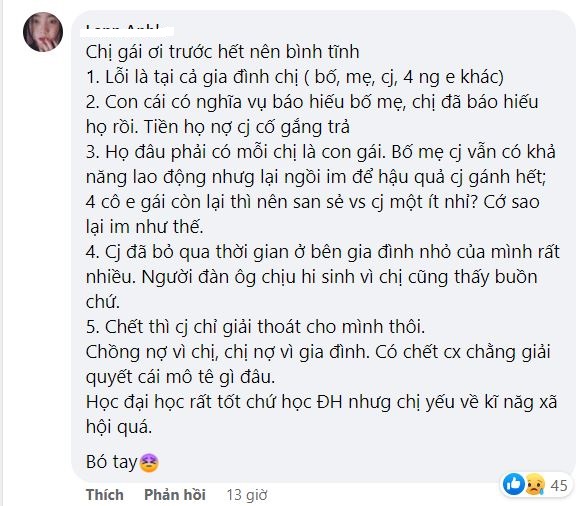 Đỉnh điểm là từ sau tết tới giờ a đã gửi về trả gần cả trăm triệu nhưng a vẫn không nói gì và cố gắng an ủi mình là ráng trả hết rồi vợ chồng cố gắng làm ăn. Mình rất biết ơn a, nhưng mọi người biết không càng trả lại càng lòi ra và mình rất chán nản, có lần mình trả trễ ngày thì tụi nó lại lên nhà đ,á,n,h, ch,ửi mẹ mình, nhà mình toàn là con gái nên k làm gì được, mình tính bỏ mặc kệ không quan tâm nhưng nghĩ tới cảnh mẹ già còn phải chịu như vậy nên mình và chồng ráng trả, vì nhà mình nghèo sợ k trả được nên bà con đồng họ k ai dám cho nhà mình mượn vì thế mẹ mình vs vậy của xã hội đen.