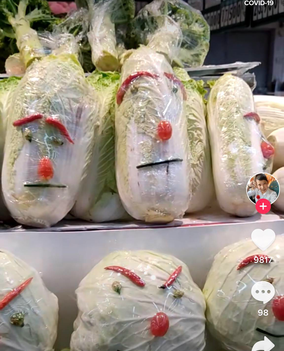 Chẳng biết là nhờ vào chỉ thị của cấp trên hay bắt nguồn từ động cơ nào mà các nhân viên siêu thị này đã dùng ớt và cà chua tạo cho bắp cải thành hình những khuôn mặt hài hước khác nhau. Nhân viên siêu thị mà hài hước thế này không khéo lại được tăng lương ấy chứ nhỉ?