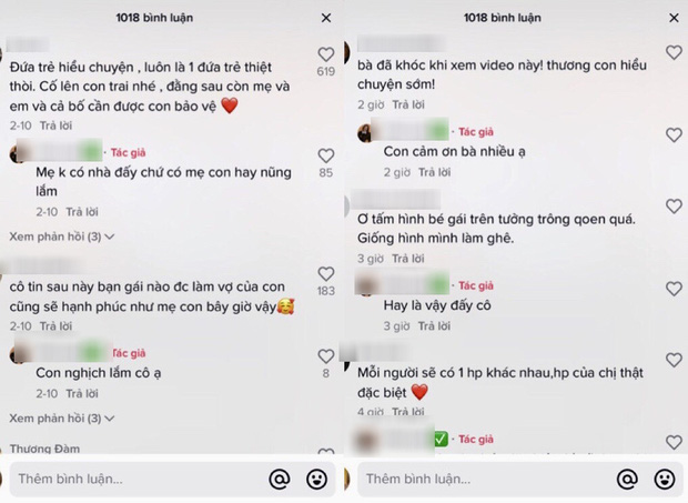 Mình thường chia sẻ những clip về cuộc sống thường ngày của gia đình lên mạng, và mẹ con mình rất vui khi được mọi người vào động viên, sẻ chia. Có người thương còn đề nghị giúp đỡ nhưng mình từ chối vì vẫn cố gắng được, chỉ cần nghe động viên là vui rồi.