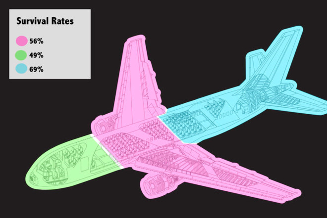 Tạp chí Popular Mechanics cũng từng đưa ra thống kê tương tự: Tỷ lệ sống sót ở các ghế phía sau là 69%, phần giữa máy bay là 56% và phần đầu là 49%.