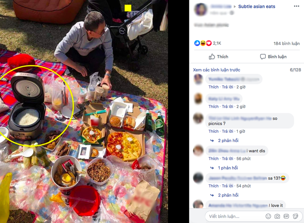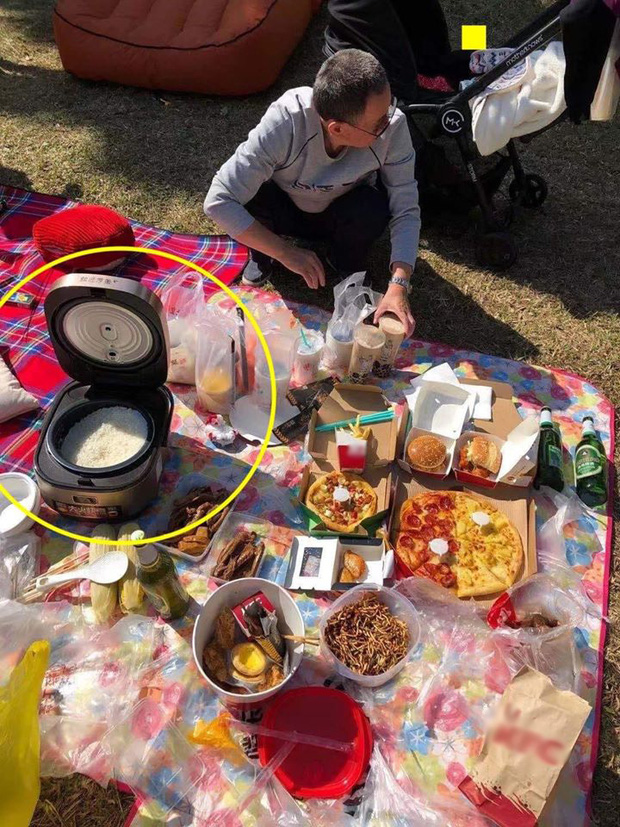 Ai cũng biết đi picnic thì đồ ăn mang kèm thường sẽ là món nhẹ hoặc món ăn nhanh như sanwich, bánh mì, hoa quả,... Tuy nhiên, gia đình này phụ huynh nhất quyết phải mang theo cơm mới được. Nhìn nồi cơm đầy ắp lạc loài giữa một đống pizza, gà rán, ai cũng phải phì cười.