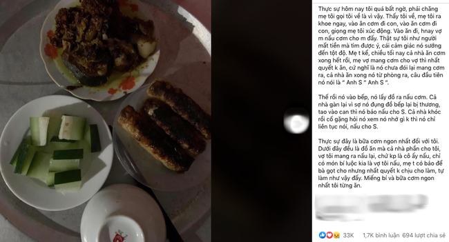 Bài viết đính kèm hình ảnh mâm cơm nguội lạnh nhưng ấm lòng ngay khi chia sẻ đã nhanh chóng nhận về 33.000 like cùng hàng ngàn bình luận.