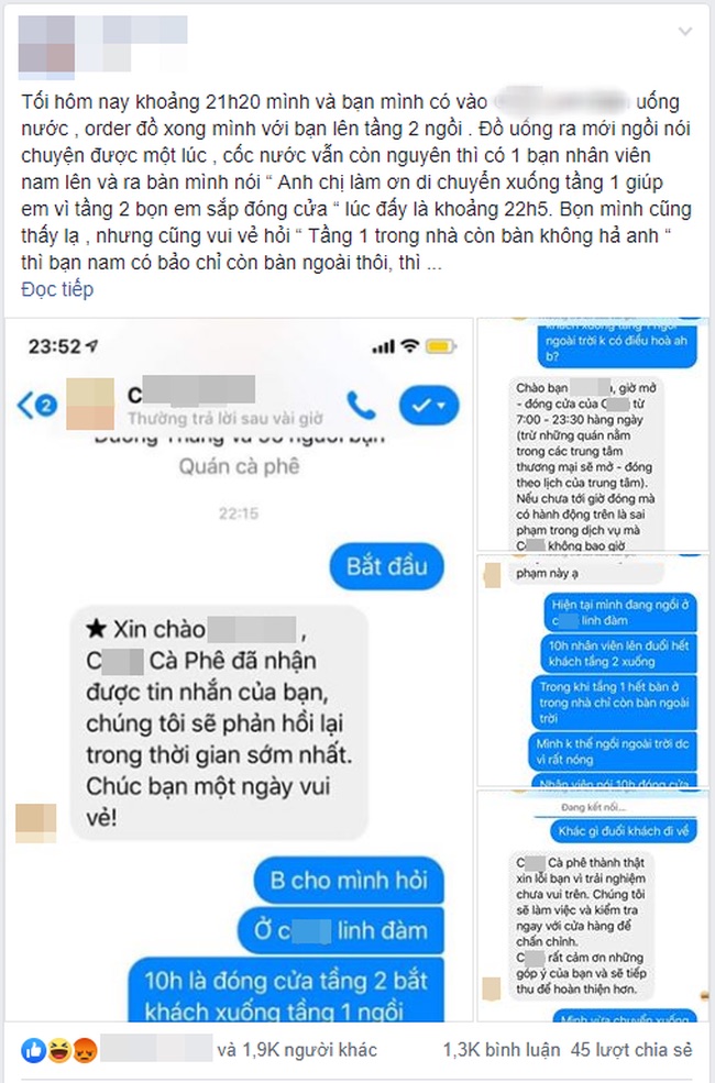 Thế nên đúng 22h40', chị C.C cùng bạn đã phải ra về với tâm trạng khá bực mình vì "lần đầu thấy 1 quán cà phê đóng cửa trước 23h và đuổi khách trước 1 tiếng xuống hết tầng 1 để nhân viên dọn tầng 2.