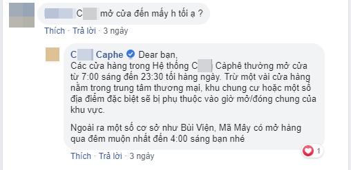 Trên fanpage của C. Cà phê cũng trả lời công khai rằng mở cửa từ 7:00 sáng đến 23:30 tối hàng ngày.