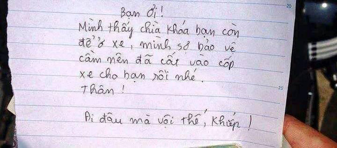 "Bạn ơi, mình thấy chìa khóa bạn còn để ở xe. Mình sợ bảo vệ cầm nên đã cất vào cốp xe cho bạn rồi nhé. Thân, đi đâu mà vội thế, khiếp".