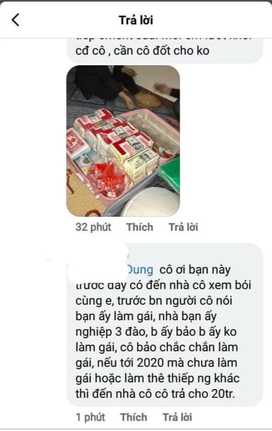 Cô còn bảo em chỉ có đi làm gái thôi chứ chẳng làm được cái gì khác cả. Cô khẳng định em có 2 vong nhi nam theo và là em bỏ chúng nó trong khi em còn không động vào trai thì lấy đâu ra có bầu? Cô còn bảo số em không bao giờ được cưới hỏi đoàng hoàng. Lúc ấy là tầm tháng 4, tháng 5 năm 2019, cô bảo giờ cô với em cá cược nếu đến năm 2020 mà em vẫn không đi làm phò thì đến cô cho 20 triệu.