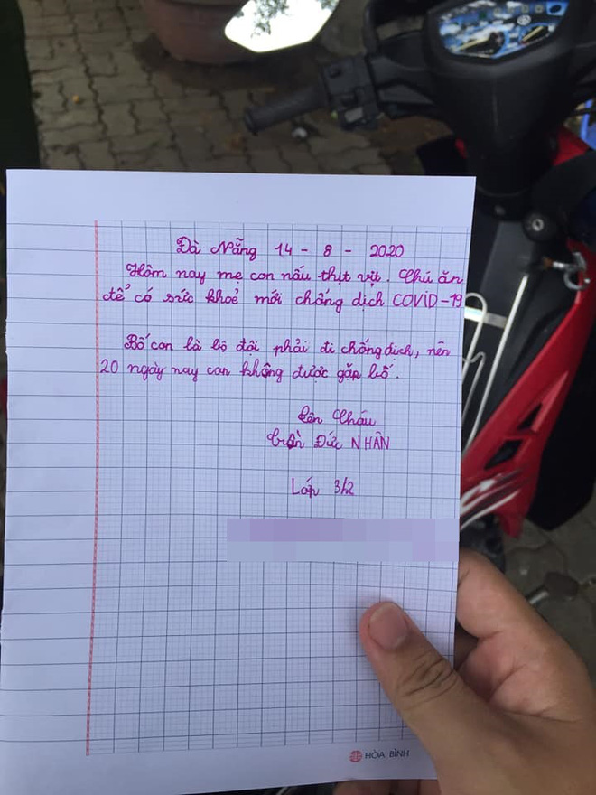 "Đây là lần thứ 2 bé gửi đồ ăn đến cho mọi người ở khu cách ly tại Hòa Xuân rồi. Lúc đọc thư bé, anh em xúc động lắm. Nó như tiếp thêm sức lực cho anh em tham gia chống Covid-19. Có lẽ do ba bé là bộ đội nên bé càng thấu hiểu hơn cho mọi người", anh Vang chia sẻ.