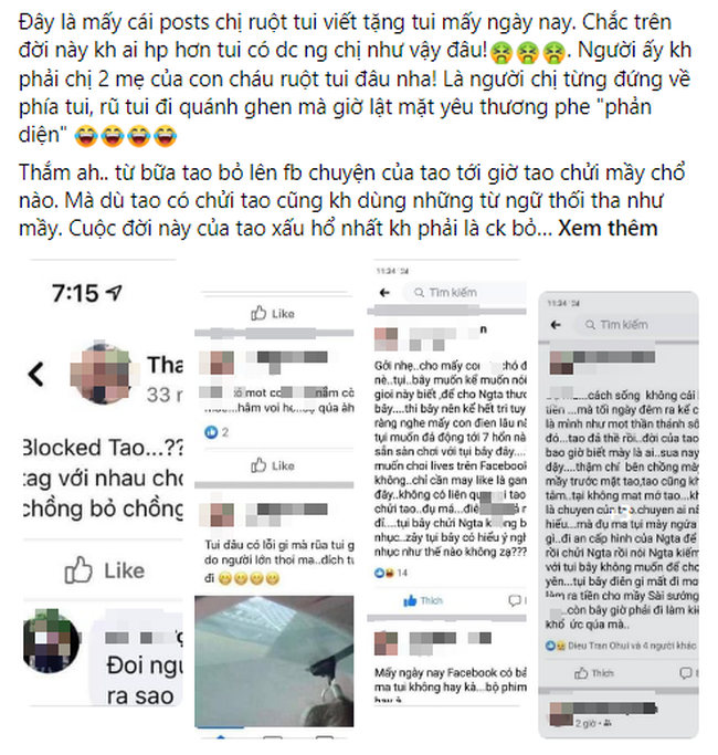 Bài viết có nội dung như sau: "Đây là mấy cái posts chị ruột tui viết tặng tui mấy ngày nay. Chắc trên đời này không ai hạnh phúc hơn tui có được người chị như vậy đâu! Người ấy không phải chị 2 - mẹ của con cháu ruột tui đâu nha! Là người chị từng đứng về phía tui, rủ tui đi quánh ghen mà giờ lật mặt yêu thương phe "phản diện".