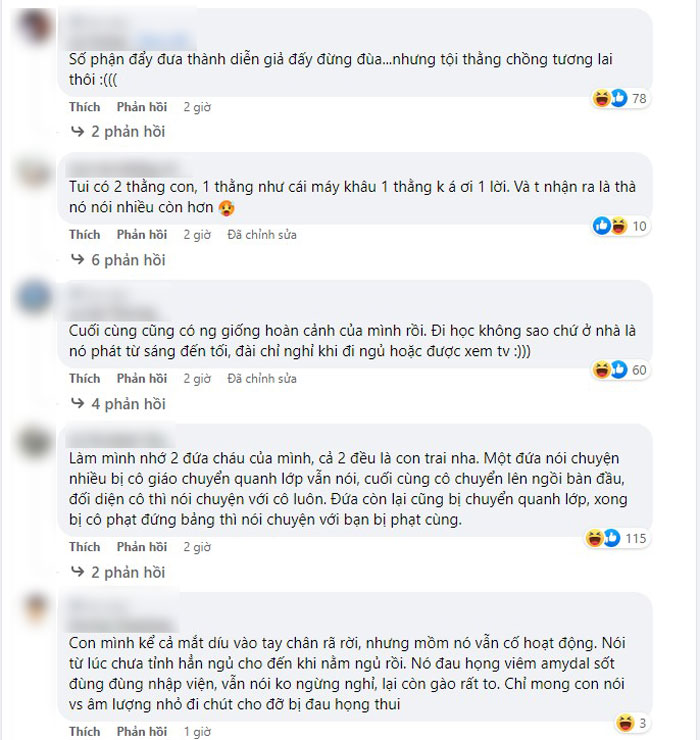 Đơn cử như trường hợp của bà mẹ dưới đây chẳng hạn. Cô đăng đàn than thở: "Em chẳng thể tưởng tượng đứa hồi bé ho gà sơ sinh suýt nữa tưởng không nuôi được. Ốm đến mức mẹ không thiết gì nữa… vậy mà giờ nói như đài phát thanh.