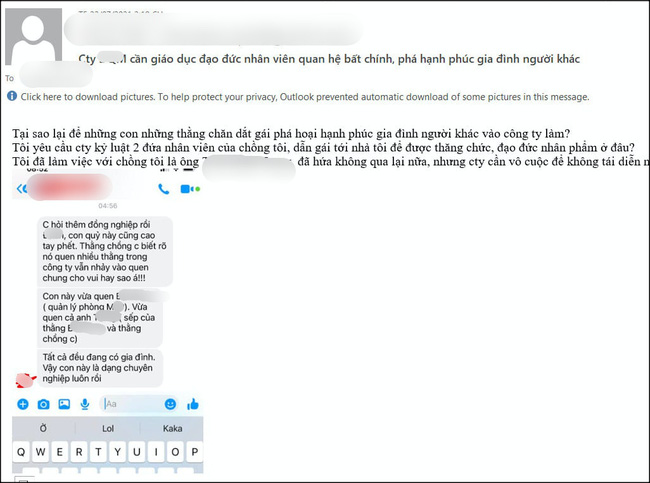 Vậy là chẳng phải đi đôi co với tiểu tam, cô vợ đã gửi Email đến cho ban lãnh đạo công ty của cô ta đang làm. Không phải Email gửi riêng mà đó là Email chung, nhân viên trong công ty ai cũng có thể đọc được.