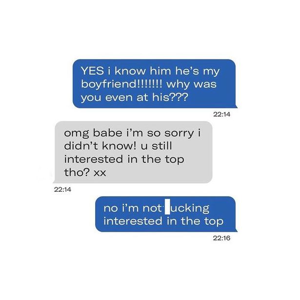 Mọi chuyện tưởng sẽ trở nên nghiêm trọng, thậm chí một trận chiến có thể nổ ra giữa 2 người phụ nữ bị gã đàn ông tệ bạc lừa dối, nhưng tất cả đều không xảy ra bởi vì thái độ của "kẻ thứ 3". Cô nàng lập tức gửi lời xin lỗi đến "chính thất" đồng thời không quên giữ lấy cơ hội bán hàng: "Trời ơi, tôi thành thật xin lỗi, tôi không hề biết. Vậy nhưng cô còn hứng thú mua cái áo kia không?".