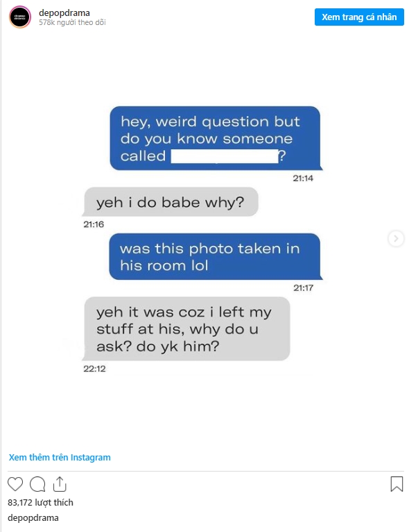 Được biết, người phụ nữ này khi đó đang lướt ứng dụng mua sắm và trời xui đất khiến thế nào mà cô lại tìm đến đúng cửa hàng online của "kẻ thứ 3". Sau một lúc nói chuyện qua lại để hỏi mua chiếc áo thun, người phụ nữ đã mạo muội hỏi: "Câu hỏi này có hơi kỳ nhưng bạn có biết anh (tên đã được che đi) không?".