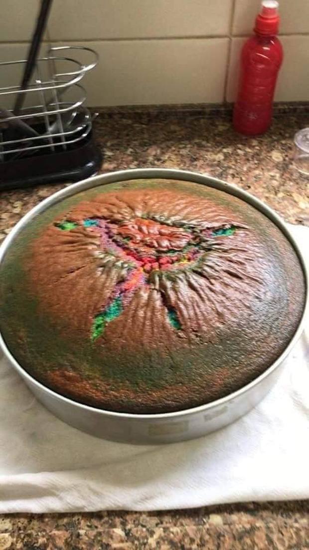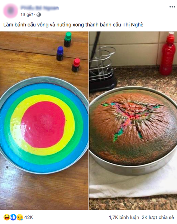 Cụ thể,câu chuyện này đã được không ít fanpage và group đông thành viên trên facebook đồng loạt đăng tải với hình ảnh trước - sau của một chiếc bánh cầu vồng và nội dung có ý ngán ngẩm vì chiếc bánh sau khi được nướng lại có hình dạng khác hoàn toàn, chưa kể còn hơi cháy vì nhiệt độ quá cao.
