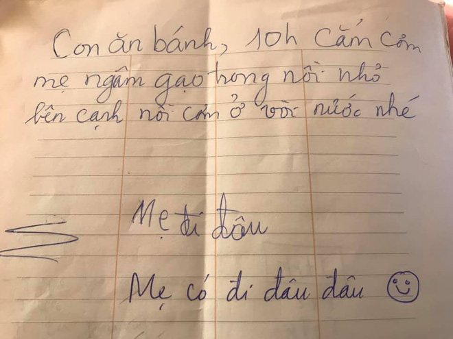 Thế nhưng điều đáng chú ý hơn lại là ở mẩu giấy nhắn bà mẹ này nhờ con làm việc nhà. Cụ thể, bà mẹ này đã viết: "Con ăn bánh, 10 giờ cắm cơm, mẹ ngâm gạo trong nồi nhỏ bên cạnh nồi cơm ở vòi nước nhé".