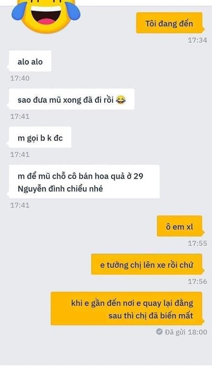 "- Sao đưa mũ xong đã đi rồi, mình gọi bạn không được. Mình để mũ chỗ cô bán hoa quả ở 29 Nguyễn Đình Chiểu nhé.