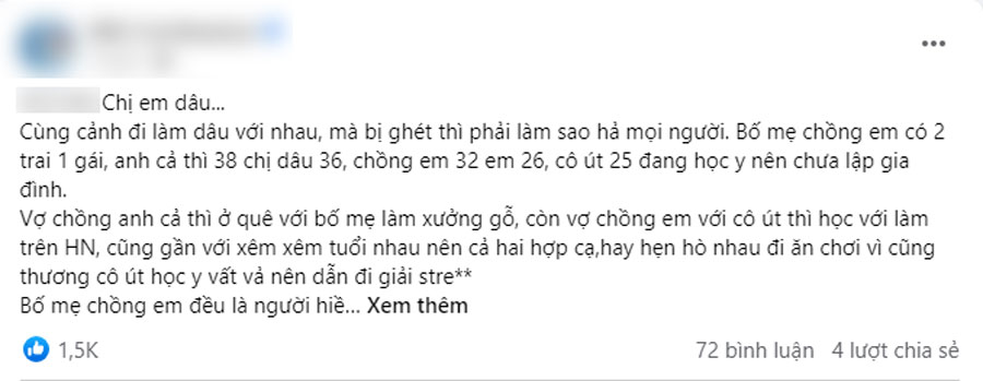 Cùng cảnh đi làm dâu với nhau, mà bị ghét thì phải làm sao hả mọi người. Bố mẹ chồng em có 2 trai 1 gái, anh cả thì 38 chị dâu 36, chồng em 32 em 26, cô út 25 đang học y nên chưa lập gia đình.