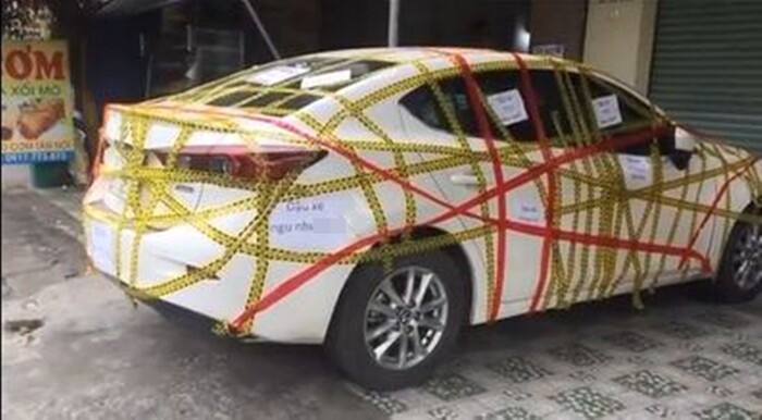Cụ thể, khi thấy chiếc xe ô tô trắng đỗ trước cửa, gia chủ đã dùng băng keo vàng, đỏ quấn chi chít quanh xe. Không chỉ “bó bột” chiếc xe lại, gia chủ còn cất công in vài tờ giấy chửi cách đỗ xe của tài xế, rồi dán lên thân xe.