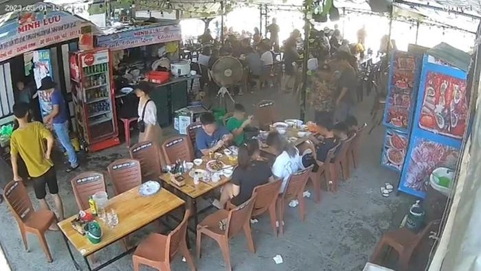 Sự việc xảy ra tại nhà hàng hải sản Minh Lưu, ở đường Trương Pháp, TP Đồng Hới vào trưa 1/5. Camera an ninh tại nhà hàng này ghi lại, khoảng 10h30, có một đoàn khách khoảng 10 người gồm cả người già và trẻ nhỏ đi hai xe ô tô đến ăn trưa.