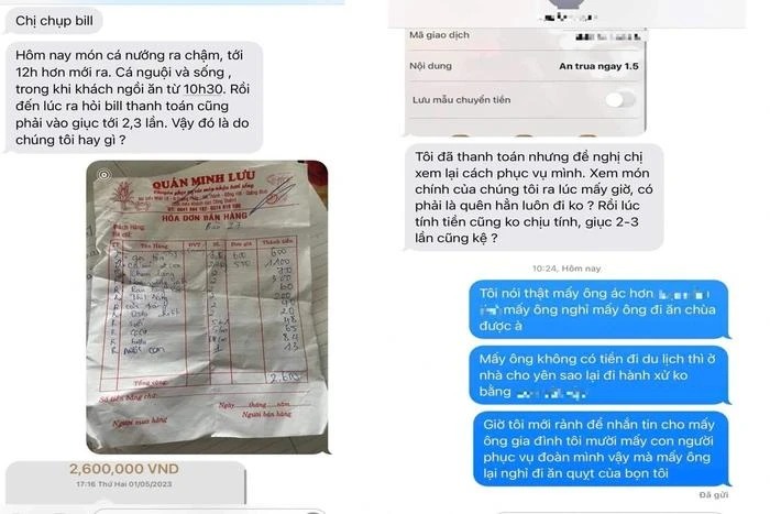 "Tôi đã thanh toán nhưng đề nghị chị xem lại cách phục vụ mình, xem món chính của chúng tôi ra lúc mấy giờ, có phải quên hẳn luôn đi không? Rồi lúc tính tiền cũng không chịu tính, giục 2-3 lần cũng kệ?", đại diện đoàn khách phản hồi trong tin nhắn gửi đến nhà hàng.