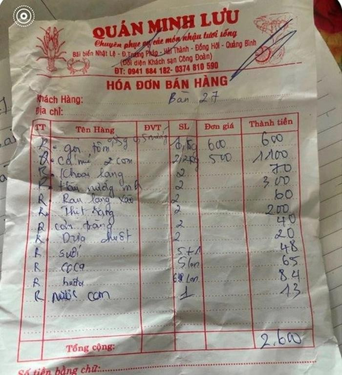 Tổng số tiền ăn trưa của đoàn khách là 2,6 triệu đồng. Sau khi chủ quán và các nhân viên trong quán phát hiện đoàn khách chưa trả tiền nên đã đăng tải câu chuyện lên mạng xã hội.