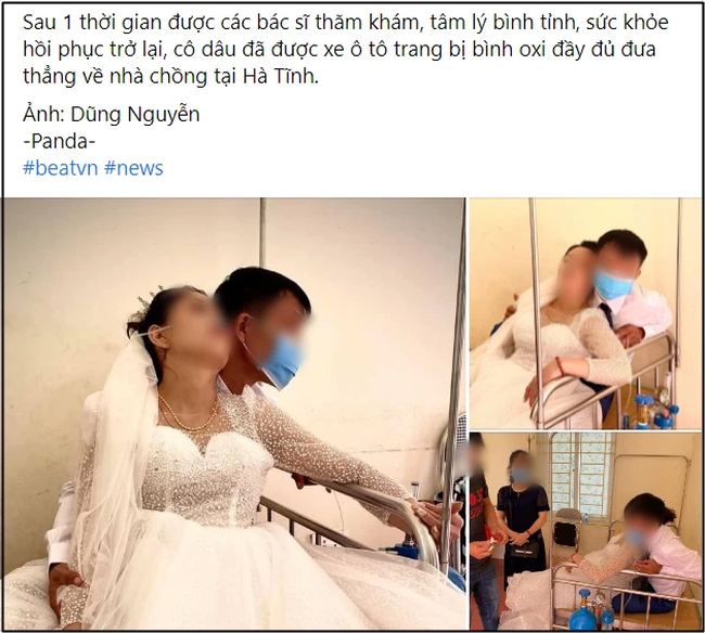 Sau 1 thời gian được các bác sĩ thăm khám, tâm lý bình tỉnh, sức khỏe hồi phục trở lại, cô dâu đã được xe ô tô trang bị bình oxy đầy đủ đưa thẳng về nhà chồng tại Hà Tĩnh".