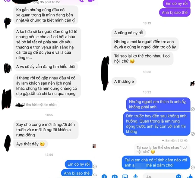 Đây chính là đoạn hội thoại của anh chàng với một cô gái khác. Anh ta tỏ tình, hứa hẹn dù đối phương đã có người yêu. Bản thân anh ta cũng ý thức được bản thân đang trong mối quan hệ khác nhưng vẫn đòi tiến đến.