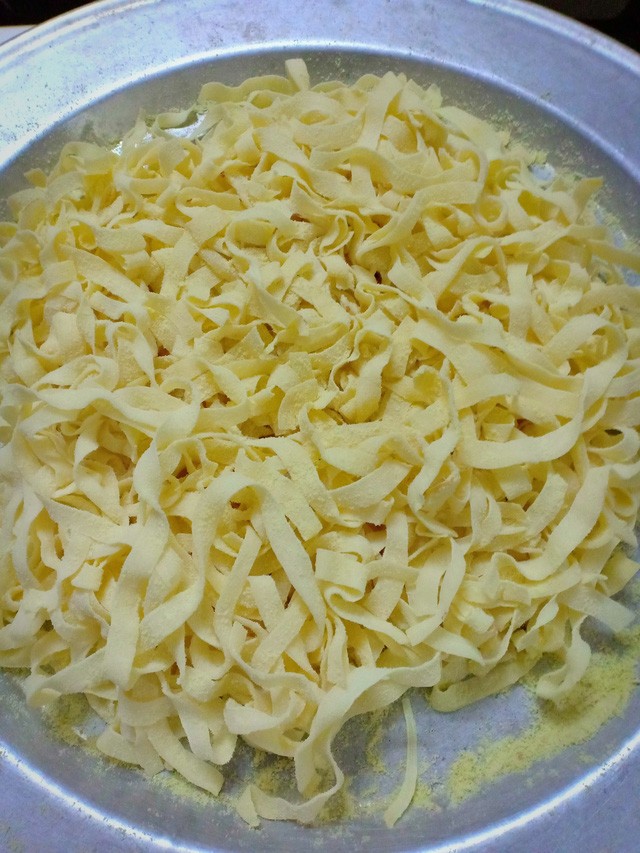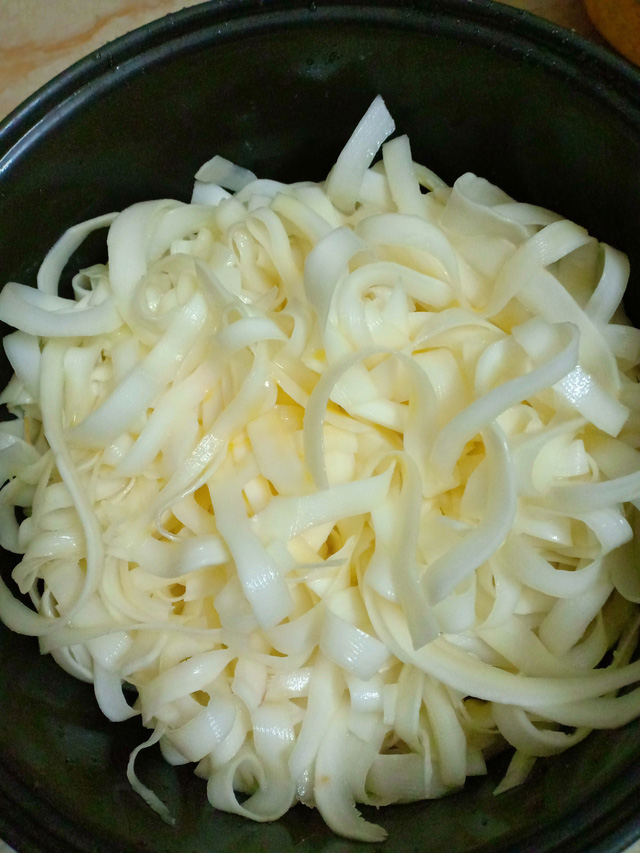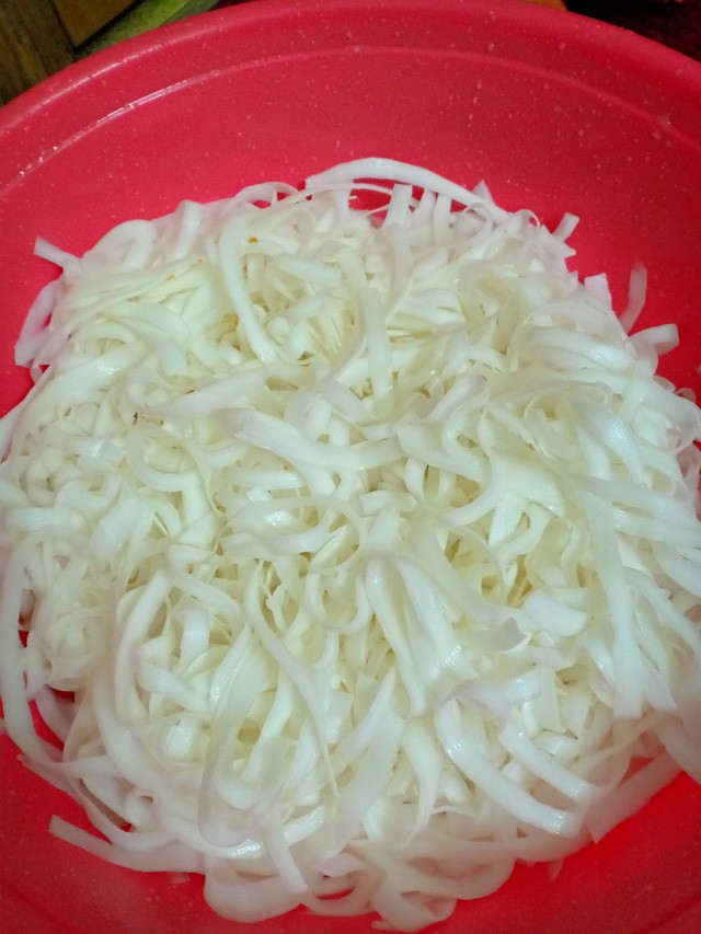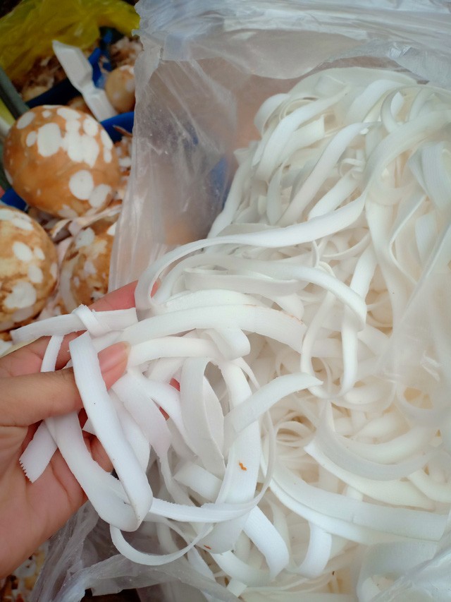 Dừa bánh tẻ sau khi mua về, bào mỏng rồi rửa với nước sạch. Cho dừa nạo chần qua nước sôi để loại bớt tinh dầu dừa. Vớt ra, để ráo nước.