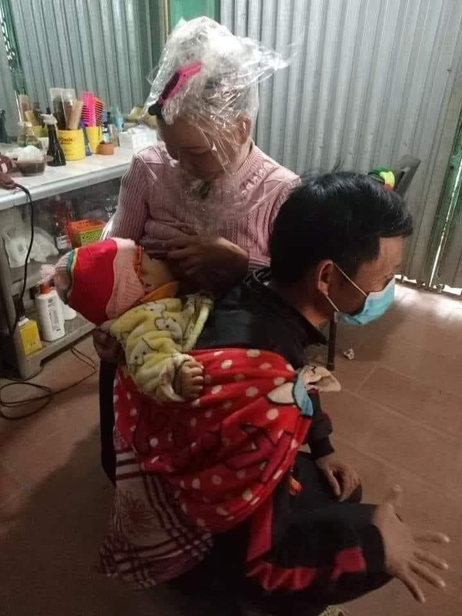 Bức ảnh đặc biệt xuất hiện trên mạng xã hội trong sáng ngày 16/1. Theo đó người đàn ông ngồi xổm, địu con để vợ cho bé bú. Trong khi đó, người vợ đang làm dở mái tóc. Cũng chính vì thế mà anh chồng phải đưa con nhỏ theo cùng để vợ tiện chăm sóc.