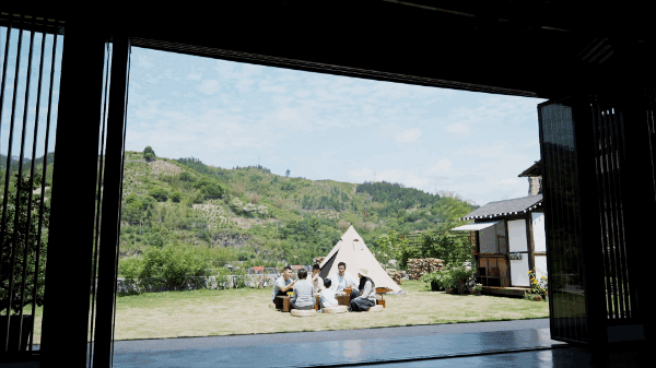 Để các vị khách đến đây cảm nhận được môi trường tự nhiên của vùng nông thôn, diện tích không gian công cộng được xây dựng gấp đôi không gian riêng tư. Ngoại trừ 4 phòng trải chiếu tatami và đại sảnh, còn lại toàn bộ là không gian ngoài trời: một khu vườn lớn hình thoi, một không gian thủy cảnh lộ thiên và hành lang.