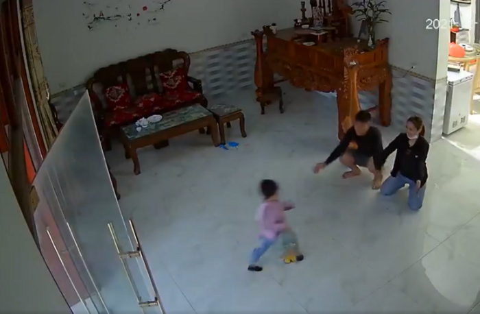 Thế nhưng, khi nghe tiếng con trai nhỏ từ đằng xa, người mẹ liền buông điện thoại, chạy ra giữa nhà quỵ thụp xuống, giang hai tay và hào hứng nói: "Yêu, yêu, yêu". Lúc này, người bố cũng chạy ra giang tay để ôm cậu con trai, tuy nhiên, cậu bé đã chọn ngã nhào vào lòng người mẹ.