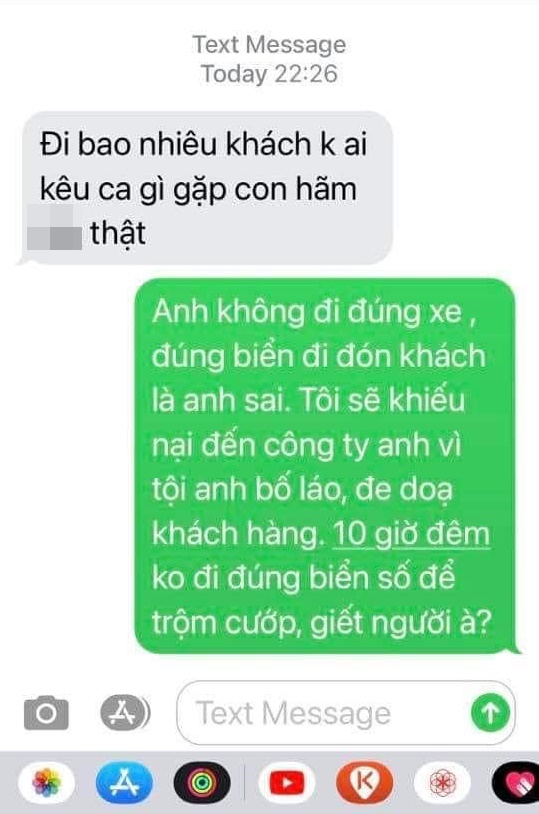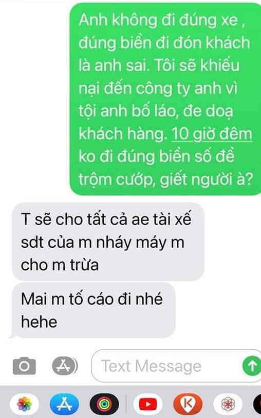- Anh không đi đúng xe đúng điển đi đón khách là anh sai. Tôi sẽ khiếu nại đến công ty anh vì tội anh bố láo, đe dọa khách hàng. 10 giờ đêm không đi đúng biển số để trộm cướp, giết người à?
