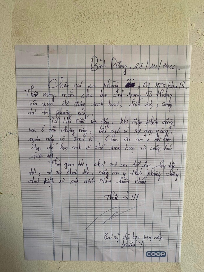 Anh chia sẻ, từ Hà Nội vào đây, khi được phân công vào ở căn phòng này, bất ngờ vì sự gọn gàng, ngăn nắp và sạch sẽ. "Cám ơn các em đã dọn dẹp để bọn anh có chỗ sinh hoạt và công tác thật tốt. Trong thời gian tới, chúc các em trở lại học tập tốt, có sức khỏe tốt, nâng cao ý thức phòng chống dịch bệnh vì một Việt Nam luôn khỏe. Thân ái!", bác sĩ ghi tiếp.