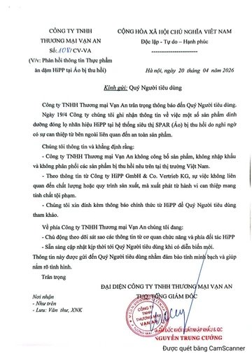 Trước diễn biến này, Công ty TNHH Thương mại Vạn An – đơn vị nhập khẩu và phân phối sản phẩm HiPP tại Việt Nam từ năm 2003 – cho biết đã làm việc trực tiếp với nhà sản xuất để xác minh thông tin. Theo đó, việc thu hồi chỉ áp dụng đối với các sản phẩm được phân phối qua hệ thống SPAR tại Áo, không liên quan đến các thị trường khác.