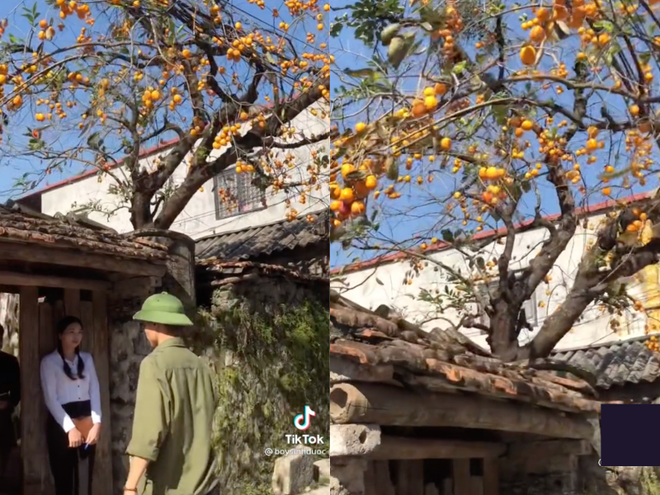 Cây hồng được trồng trong sân một ngôi nhà mái ngói cổ đậm kiến trúc nông thôn Bắc Bộ, cổng lợp ngói với cánh cửa gỗ đặc trưng, phía ngoài là tường bao riêu phong in dấu vết thời gian. Tuy nhiên, không hiểu sao nhiều bạn trẻ lại cho rằng khung cảnh này giống... Hàn Quốc nên đã mặc hanbok đến đây chụp ảnh.