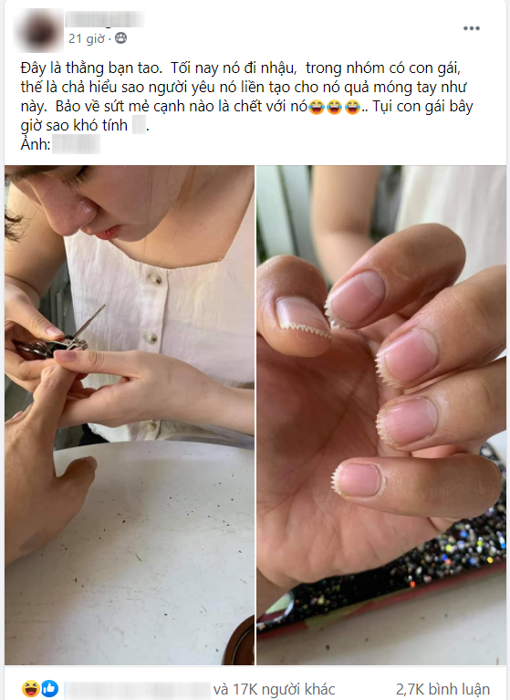 "Đây là thằng bạn tôi. Tối nay nó đi nhậu, trong nhóm có con gái, thế là người yêu nó liền tạo cho nó quả móng tay như này. Bảo về sứt mẻ cạnh nào là chết với nó. Tụi con gái bây giờ sao khó tính thế" - tài khoản L.H viết.